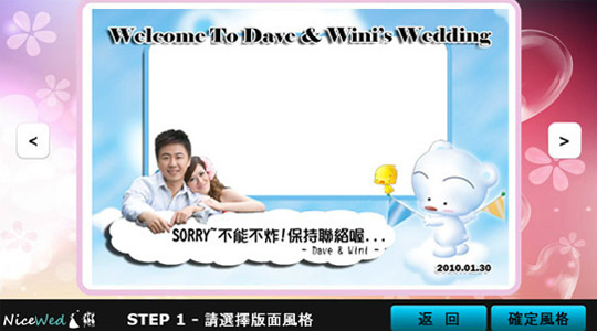 賓客可自行點選畫面左右鍵選擇喜愛的拍照模版,版型設計預設為十組背景去搭配三組人物,並可依新人喜好加註各式文字。