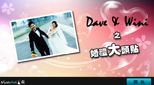 賓客快拍機的起始畫面,可提供新人設置姓名資訊及照片供賓客辨識,使用者點選右下方開始鍵即可進入拍照程式。