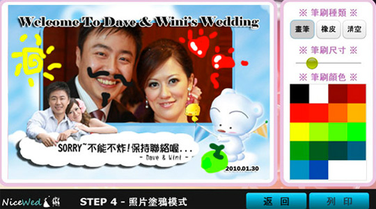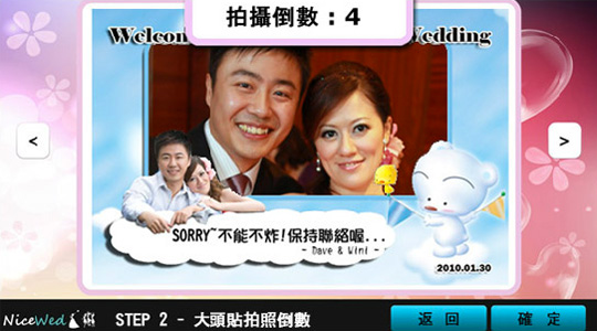 賓客可自行點選畫面左右鍵選擇喜愛的拍照模版,版型設計預設為十組背景去搭配三組人物,並可依新人喜好加註各式文字。