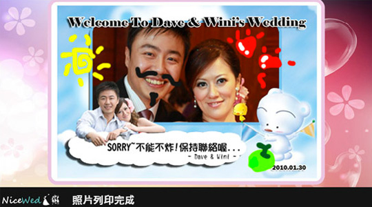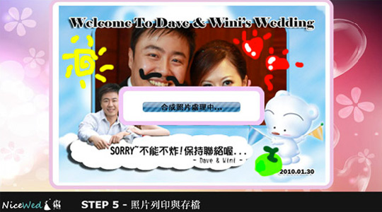 拍攝完成後僅需約略40秒即可以高級彩色相紙輸出4*6合成照片,同時也會儲存電子檔供即時投影系統、交付新人及網路相簿使用。